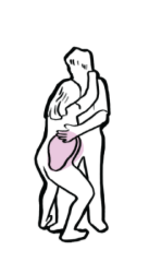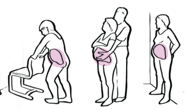 Rodząca stoi, kołysze biodrami, trzyma się stabilnej powierzchni lub partnera.
