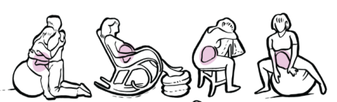Rodząca siedzi na dużej piłce, kołysze się lub krąży biodrami.